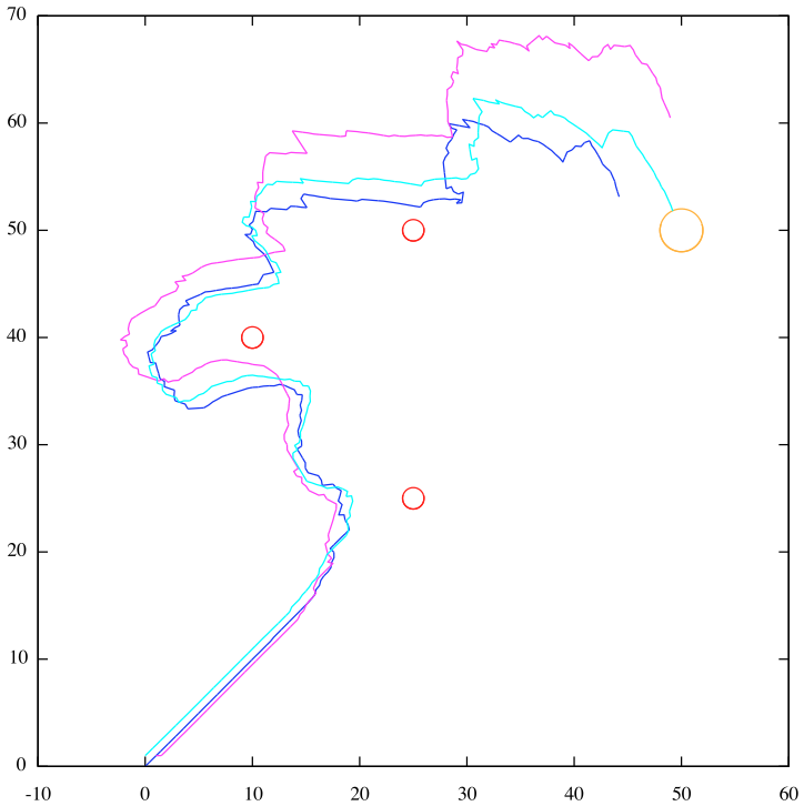 Initially, the robots start moving towards the goal (i.e. the big circle in the upper-right corner). As soon as an obstacle enters into the range of their distance scanners, the robots change their directions and pass over the obstacle. This way, they reach without collisions the goal.