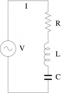 You can see several instances of different kinds of components, connected in certain ways and with annotations, typically referring to (physical) quantities related to electricity. I want to elaborate a little bit more on electrical circuits and maths. To that purpose, let's use a simpler schema, which we all have probably got acquainted with at high school, the so-called RLC circuit.