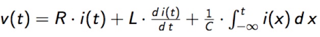 A closer look at the RLC circuit, and some basic knowledge of physics, allow us to express the relationships between the components of the circuit and the physical quantities of interest, e.g. the current i and voltage v at the power unit terminals (PU), at any point in time, as follows: