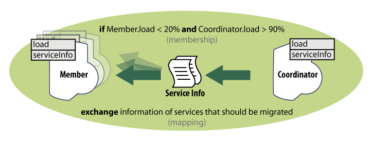 The second step is to define the actual component interaction and exchange of their knowledge. In this example, only the transfer of the information about services to be migrated from the overloaded nodes to the idle nodes is defined. The interaction is captured in a form of an ensemble definition (Figure 2), thus representing a “template” for interaction. Here, the coordinator, as well as the members, has to be an execution node providing the load and serviceInfo knowledge entries. Having such nodes, whenever the (potential) coordinator has the load above 90% and a (potential) member has the load below 20% (i.e., the membership function returns true), the ensemble is established and its mapping function is executed (possibly in a periodic manner). The mapping function in this case ensures exchanging the information about the services to be migrated from the coordinator to the members of the ensemble.